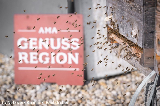 Bild: Die Wiener Bezirksimkerei ist Teil der AMA Genussregion: Wiener Bezirksbienen vor AMA Genussregion Schild.